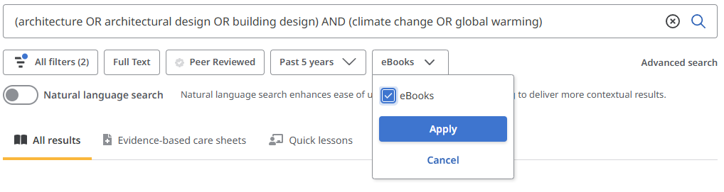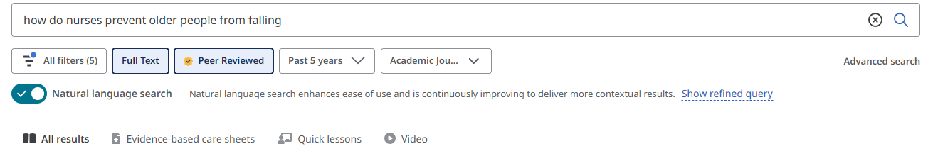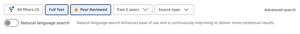 Natural Language: Natural Language Search (NLS) mode is used in Advanced Search. It allows you to search using everyday language instead of relying on keywords or Boolean operators