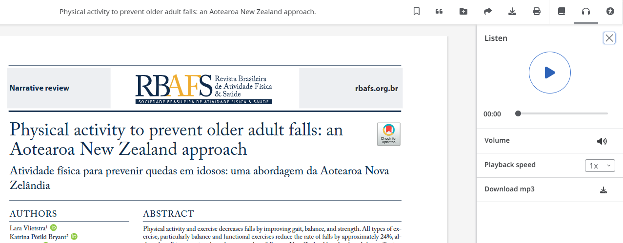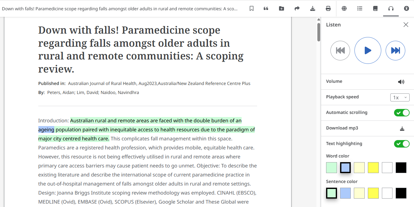 There is a Read aloud/text to speech feature for both the PDF and Online Full text option (Found when you click the Access options button). This feature reads all information of the article, therefore if you want to listen to the article text only, select the Online Full text option if available.